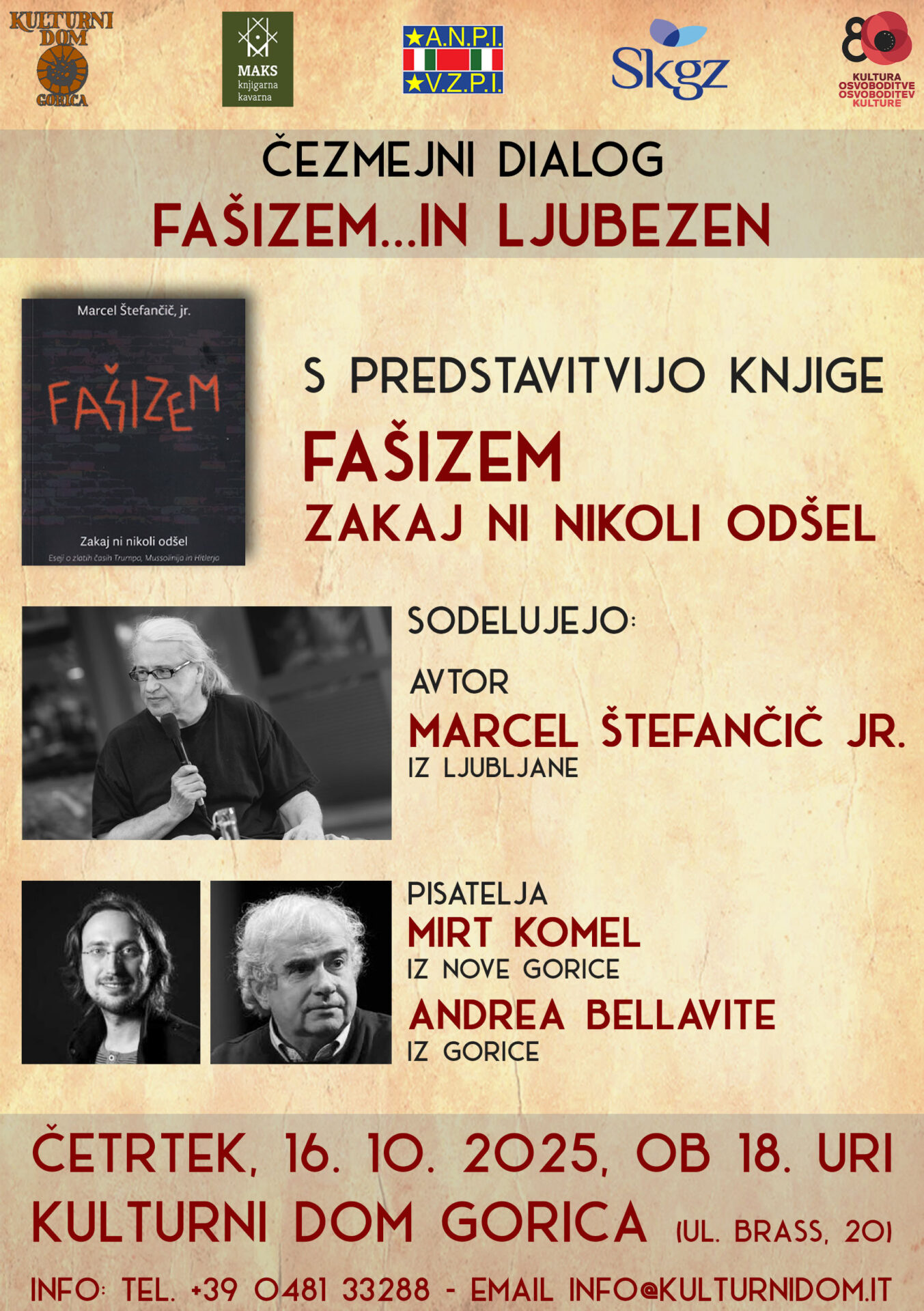Na večeru bosta poleg avtorja sodelovala čezmejna goriška pisatelja, Mirt Komel in Andrea Bellavite.