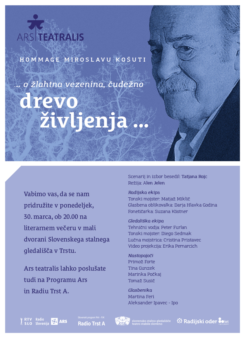 Ars Teatralis vabi na poseben literarni večer, posvečen slovenskemu pesniku Miroslavu Košuti. Dogodek z naslovom “Drevo življenja” prinaša preplet poezije, interpretacije in glasbe.