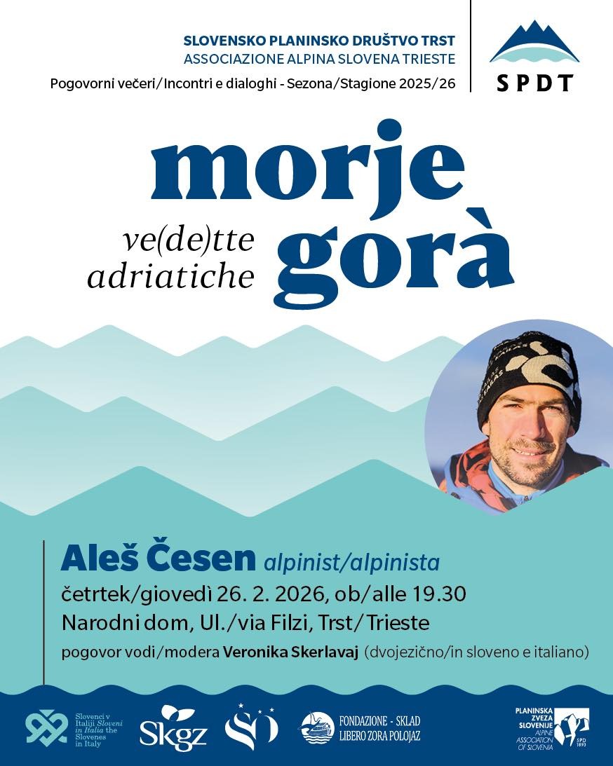 Slovensko planinsko društvo Trst vabi v četrtek, 26. februarja, ob 19.30 v Narodni dom na tretje srečanje iz niza Morje gorà – Ve(de)tte adriatiche. Gost večerja bo slovenski alpinist Aleš Česen, prejemnik treh zlatih cepinov. Pogovor bo vodila Veronika Skerlavaj. Poskrbljeno bo za tolmačenje v italijanski jezik.