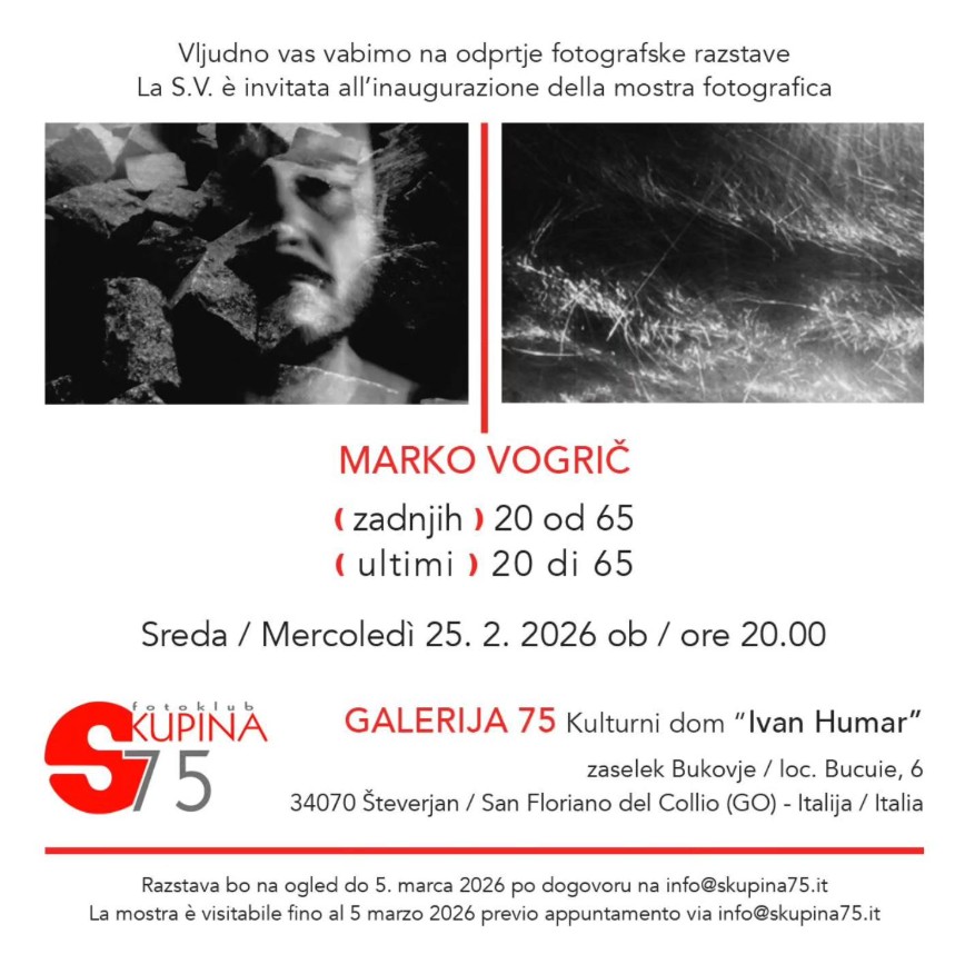 Fotoklub Skupina75 prireja v sredo, 25. februarja, ob 20. uri v Galeriji75 odprtje razstave svojega predsednika Marko Vogrič.
