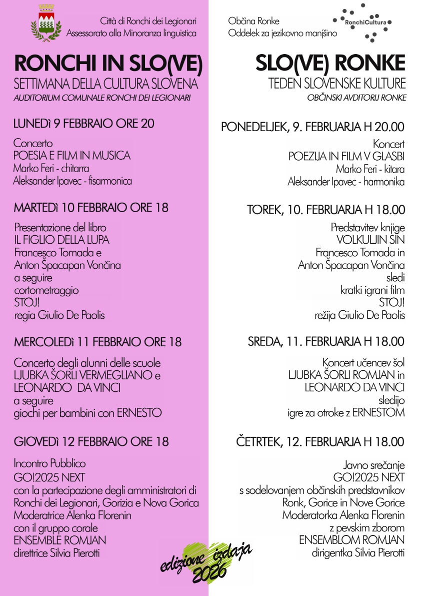 Četrtek, 12. februarja ob 18.00 uri – Javno srečanje GO!2025 NEXT s sodelovanjem občinskih predstavnikov Ronk, Gorice in Nova Gorice (moderatorka Alenka Florenin) z pevskim zborom Ensemblom Romjan dirigentka Silvia Pierotti.