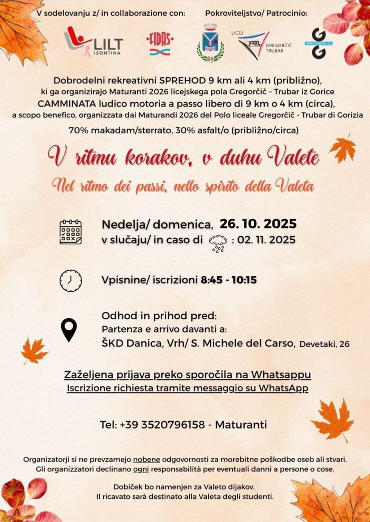 Maturanti licejskega pola Gregorčič – Trubar iz Gorice 2026 organiziramo ne-tekmovalni, prijateljski sprehod po kraških poteh (9 km oz. krajša različica 4 km), ki bo potekal v nedeljo, 26. oktobra 2025. Namen dogodka je ozaveščanje o pomenu zgodnjega odkrivanja raka dojk, zato sodelujemo z LILT Isontina – Italijansko ligo za boj proti raku. Na dogodku bodo prisotni zdravniki, maturantke pa bodo imele možnost brezplačnega pregleda dojk. Poudarjamo tudi pomen darovanja krvi in sodelujemo s krajevnim društvom krvodajalcev Sovodnje ob Soči. Za pokroviteljstvo smo zaprosili občino Sovodnje in naš šolski center. Prijave bodo potekale pred SKD Danica (Vrh Sv. Mihaela) od 8.45 do 10.15.
