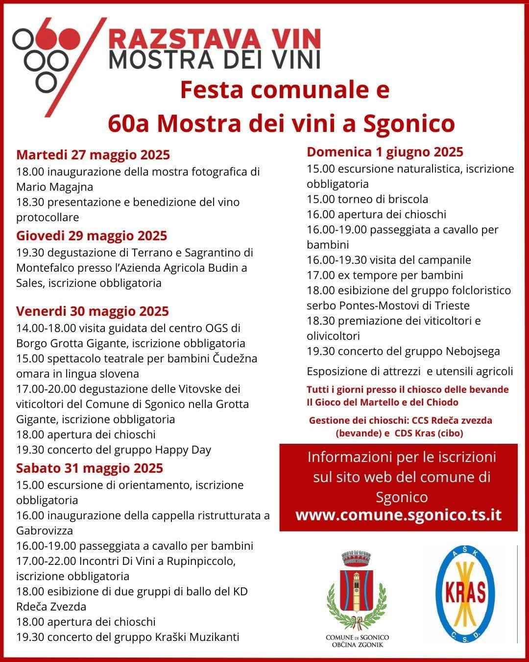 Il Comune di Sgonico-Zgonik, in collaborazione con le associazioni locali, organizza la festa comunale e la 60ª mostra dei vini. L’evento di più giorni avrà il suo momento clou domenica 1 giugno, quando saranno premiati i migliori viticoltori del comune. Il programma completo è disponibile a questo link.