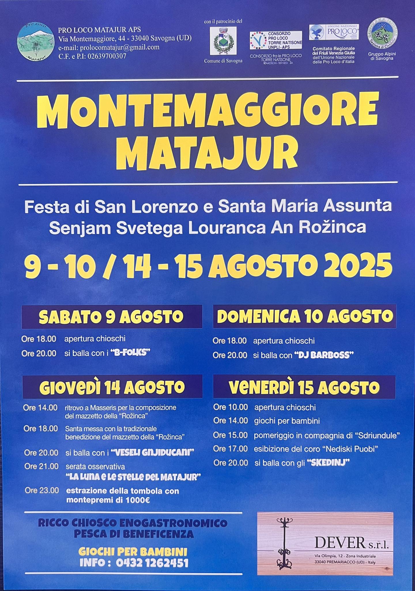 Giovedì 14 agosto, alle ore 14.00, al Masseris si terrà un incontro per la composizione del mazzeto della “Rožinca”. Alle ore 18.00 seguirà la Santa Messa con la tradizionale benedizione del mazzetto “Rožinca”. Seguirà una serata di osservazione della luna e delle stelle a partire dalle ore 21.00. Alle ore 23.00 si terrà l’estrazione della tombola con un montepremi di 1000 €.