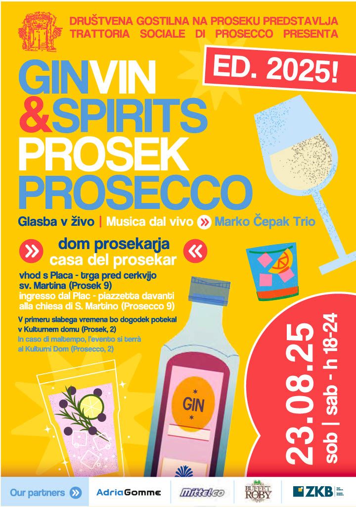 Sabato 23 agosto, dalle ore 18.00 alle ore 24.00, nel giardino della Casa del Prosekar, si terrà il festival GinVin&Spirits, un festival enogastronomico dedicato alla degustazione di vini, gin e distillati della regione Friuli-Venezia Giulia, organizzato dalla Cooperativa della Trattoria Sociale di Prosecco – Društvena gostilna na Proseku.