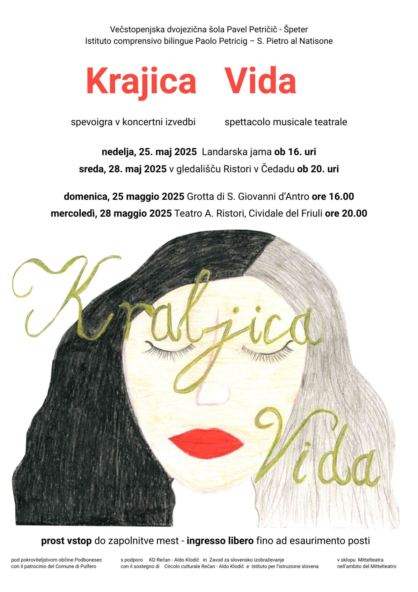 Nella letteratura musicale e corale, la storia della leggendaria figura della Regina Vida è diventata una straordinaria creazione artistica — un’opera musicale unica, che attualmente non ha paragoni sul nostro territorio. La prima esecuzione in forma di concerto si svolgerà proprio nella Grotta di San Giovanni d’Antro, luogo della leggenda, domenica 25 maggio alle ore 16.00, con il patrocinio del Comune di Pulfero. Seguirà una replica mercoledì 28 maggio alle ore 20.00 presso il Teatro Ristori di Cividale, nell’ambito del Mittelteatro.