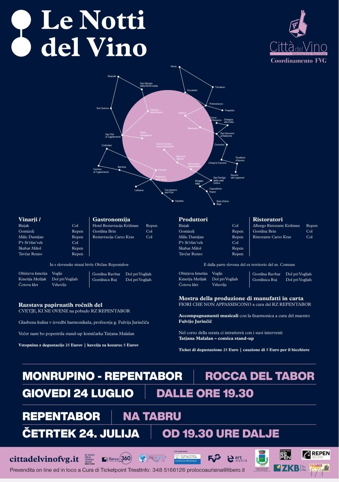 Le notti del Vino si svolgeranno a Repentabor, nel comune di Repen, il 24 luglio, a partire dalle ore 19.30. Sono previste degustazioni con sette produttori locali e tre produttori della vicina Slovenia. Ad accompagnare e arricchire la serata, ci sarà anche musica di sottofondo con fisarmonicisti.