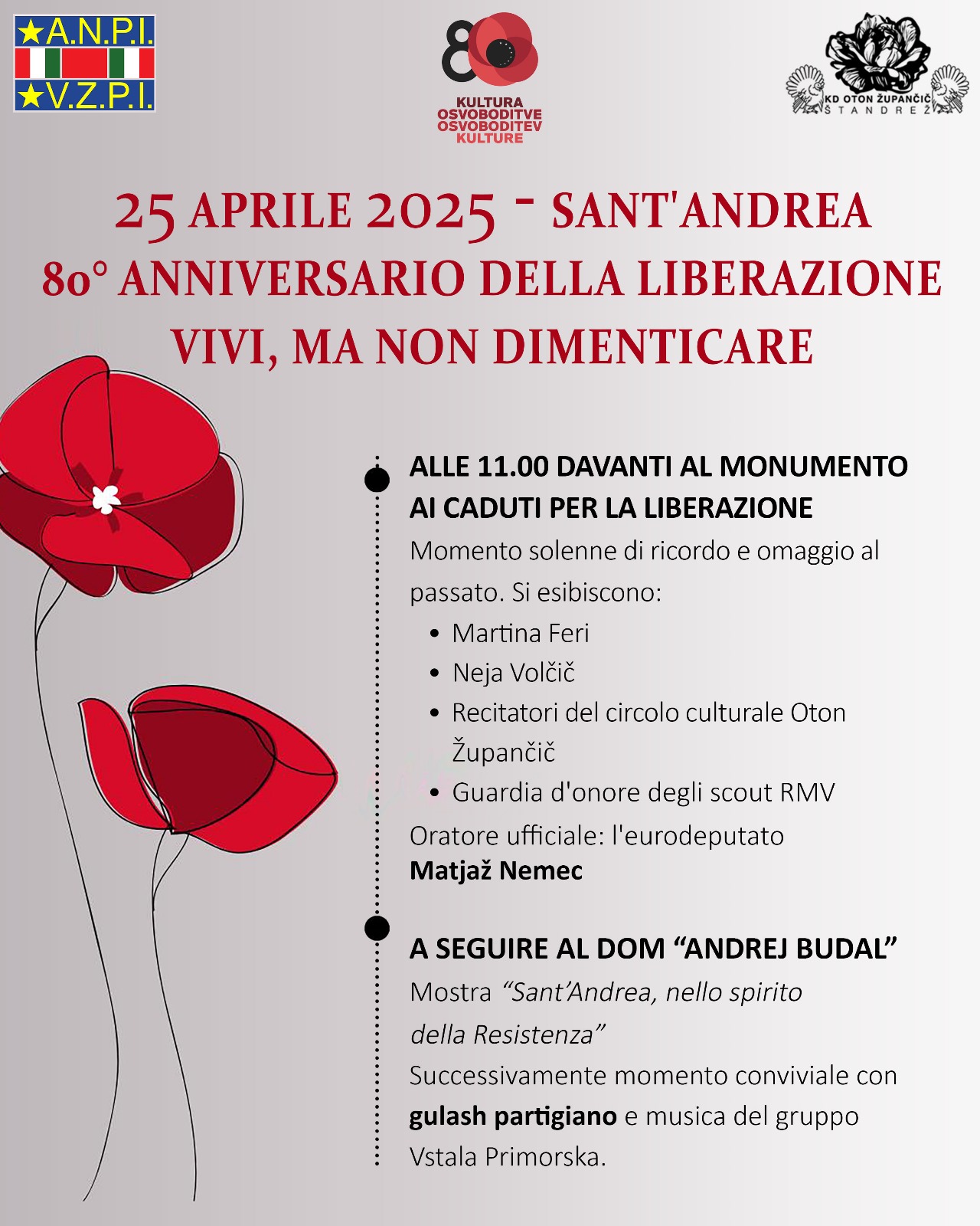 Venerdì, 25 aprile 2025, il circolo culturale Oton Župančič di Sant’Andrea organizza la cerimonia ”Vivi, ma non dimenticare”, in occasione dell’80° anniversario della liberazione.