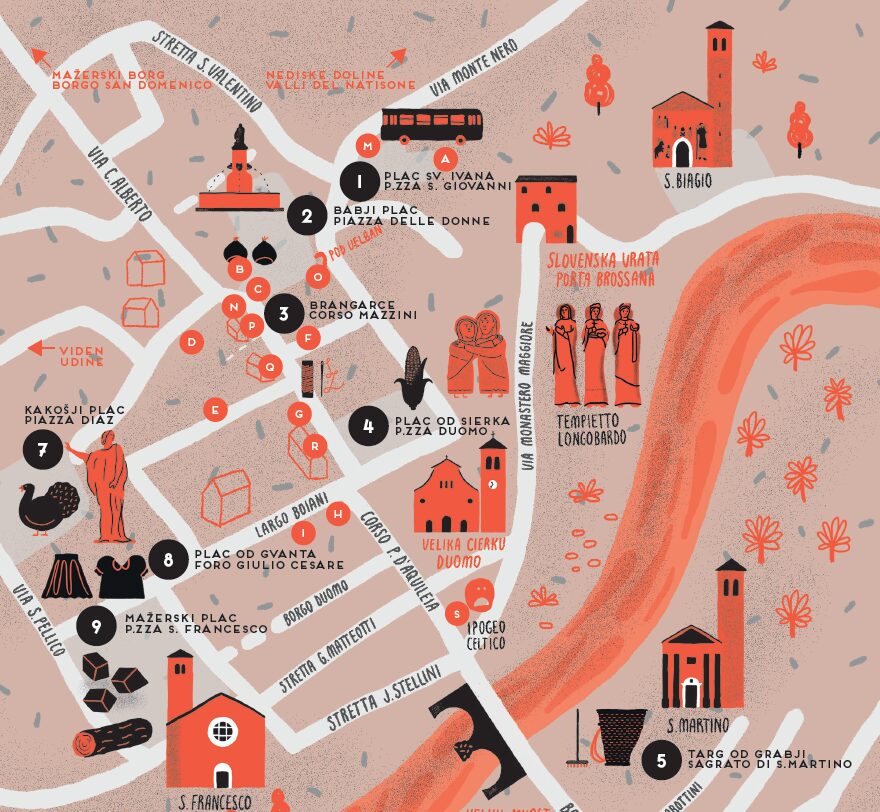 Zgibanka navaja celo vrsto slovenskih imen za vse trge in ulice, kjer so Benečani imeli opravke: Babji ali Žitni plac (trg Pavla Diakona), V Brangarcah (korzo), Velika Cierkev (stolnica), Veliki muost (Hudičev most), Targ od grablji (pred sv. Martinom), Prasečji plac (trg Resistenza), Kokošji plac (trg Diaz), Plac od gvanta (Forum Julija Cezarja) in druge.