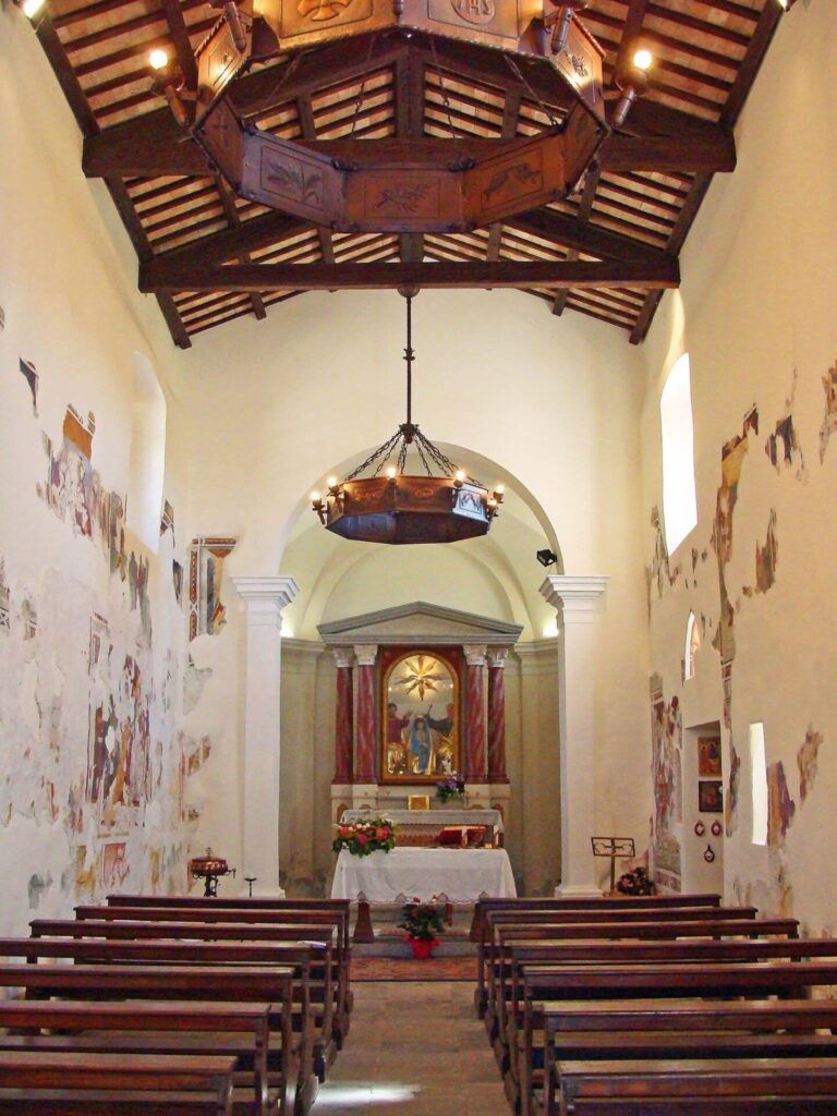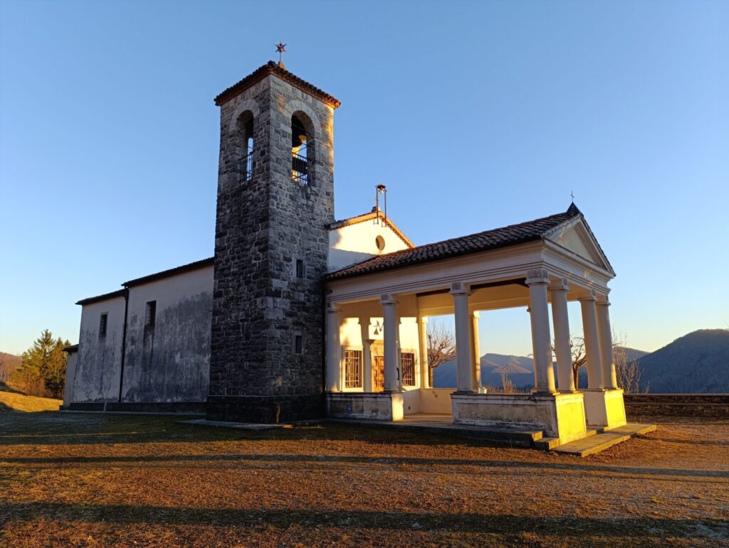 Današnja cerkev sega v srednji vek, iz tistih časov je ohranjeno gotsko okence. Na notranjih stenah si lahko ogledamo ostanke fresk iz 15. stoletja in druge zanimive umetnine, ki pričajo o živahni preteklosti tega kraja. Romarji so v zahvalo za uslišane prošnje sem prinesli množico votivnih slik, ki pa so izginile po potresu leta 1976, ki je močno poškodoval te kraje. V 20. stoletju je cerkev s pokritim stebriščem in drugimi prezidavami dobila bolj romansko podobo.